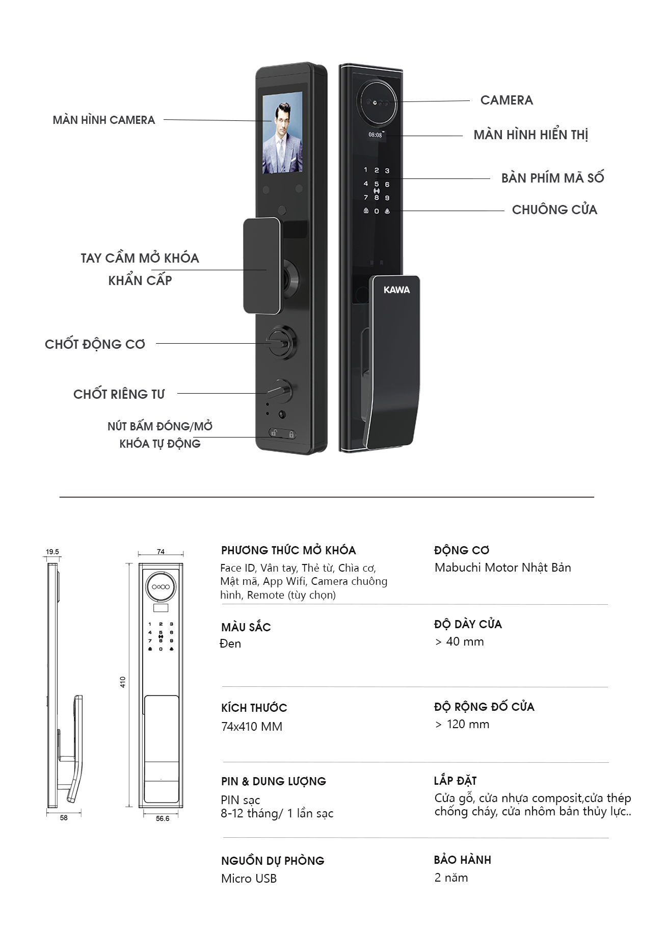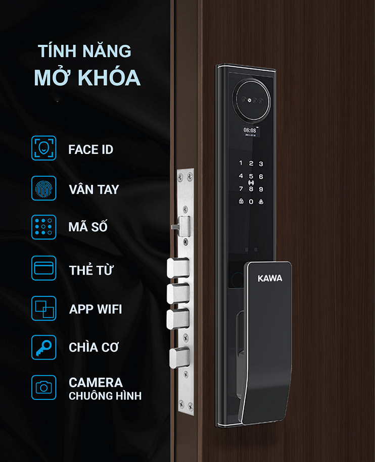 Khóa có thể mở cửa bằng nhiều tính năng: Vân tay, Mã số, Thẻ từ, Chìa cơ, App Wifi dễ dàng quản lý trên điện thoại và camera chuông hình sắc nét có thể quan sát được người bấm chuông.